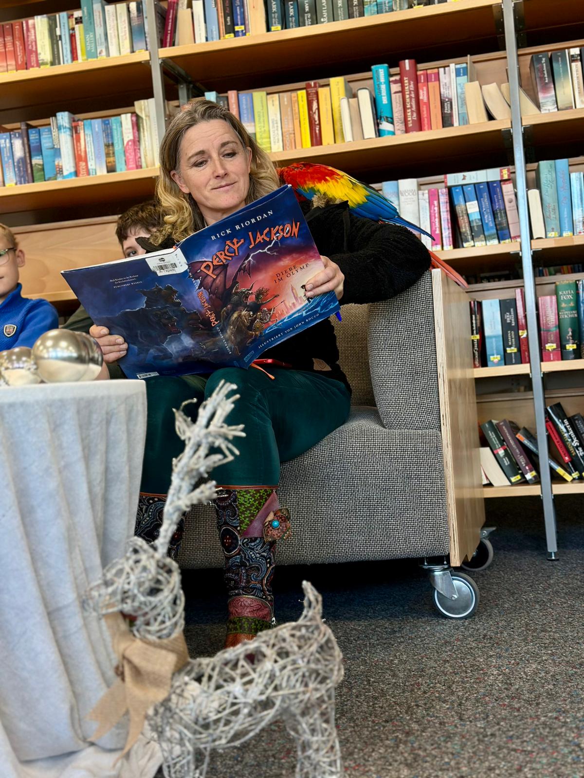 Doch damit war der Vorlesetag noch lange nicht vorbei. Jovita Wehrhahn, Inhaberin der Logopädie-Praxis „Deine Logopraxis“, brachte eine ganz besondere Lesebegleitung mit: ihren Ara, Schrägeus! Während sie den Kindern liebevoll aus einem Buch vorlas, saß der bunte Vogel auf ihrem Arm. Und das Highlight: Einige mutige Schülerinnen und Schüler durften den Ara selbst auf den Arm nehmen, ihn streicheln und seine weichen Federn fühlen. Die Kinder waren sichtlich ergriffen – so ein lebendes, sprechendes Tier beim Vorlesen war für sie ein unvergesslicher Moment.