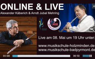 Bad Pyrmont. Freitag, 8. Mai, um 19 Uhr findet ein Online-Livekonzert mit den beiden Musikschulleitern aus Bad Pyrmont und Holzminden statt. Die beiden Konzertflötisten Arndt Jubal Mehring und Alexander Käberich bieten ein anspruchsvolles Programm mit Werken von Johann Sebastian Bach, Friedrich Kuhlau, Goffredo Petrassi und Wil Ofermanns: Neben barocken Inventionen von Bach sind romantisch, virtuose Duette des Beethoven-Freundes Kuhlau zu